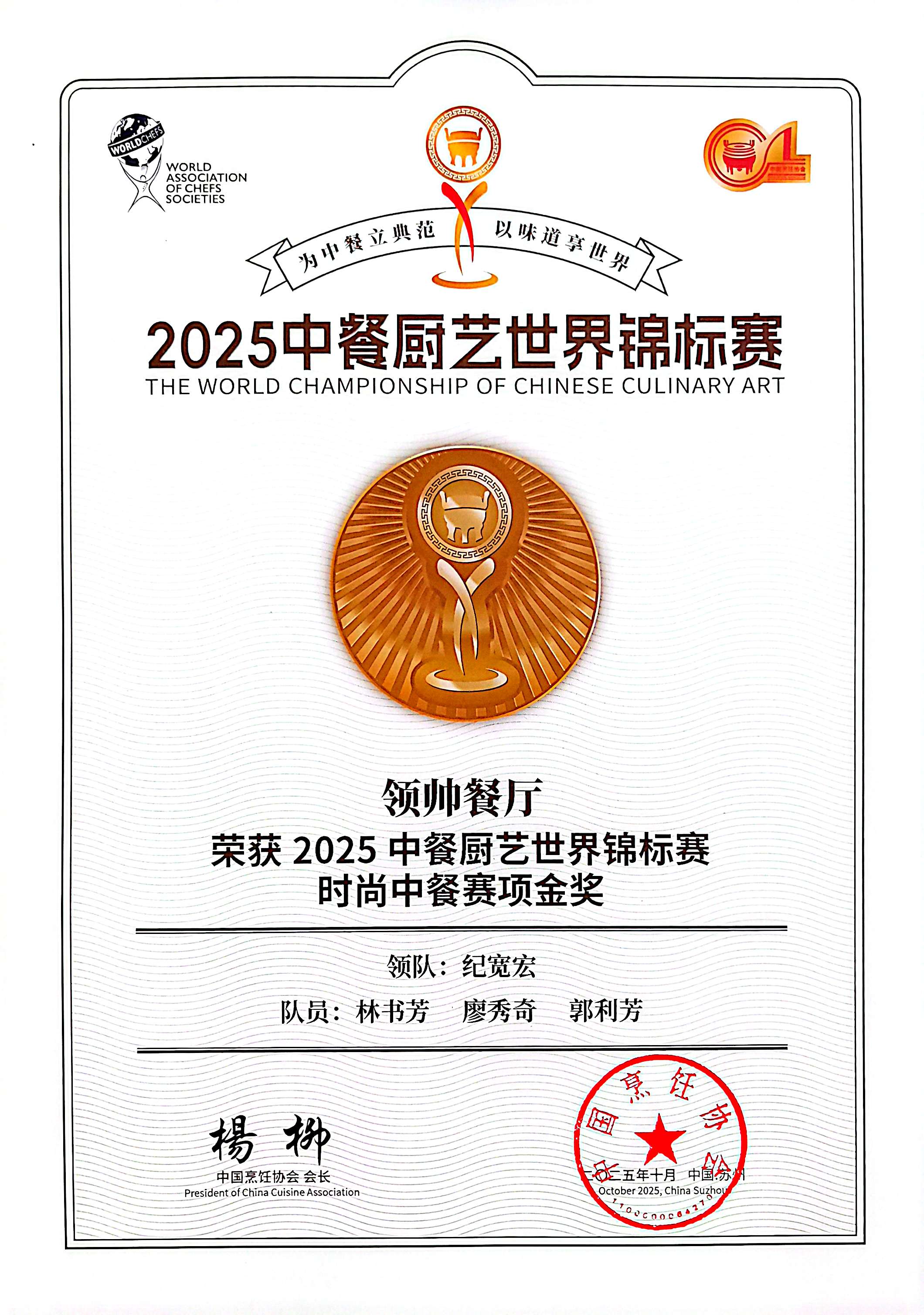 纪宽宏国家级技能大师工作室团队斩获2025中餐厨艺世界锦标赛金奖