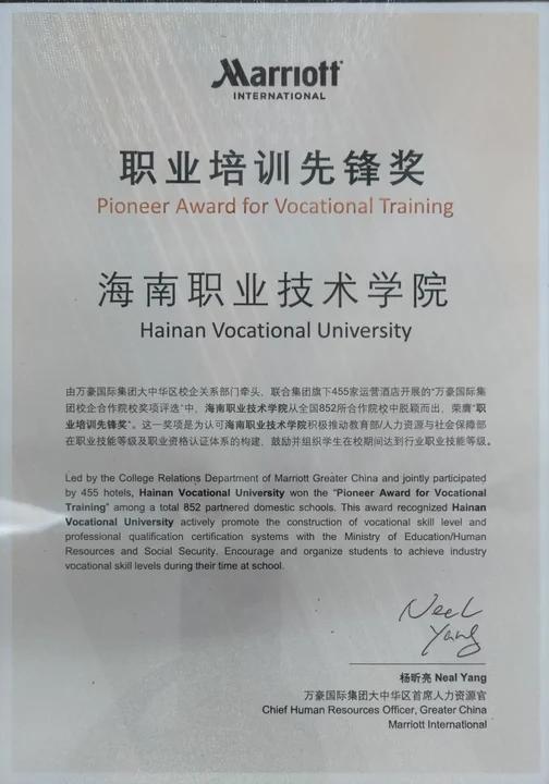 产教融合结硕果,“海职经验”赢赞誉:我院荣获万豪国际集团“职业培训先锋”奖项