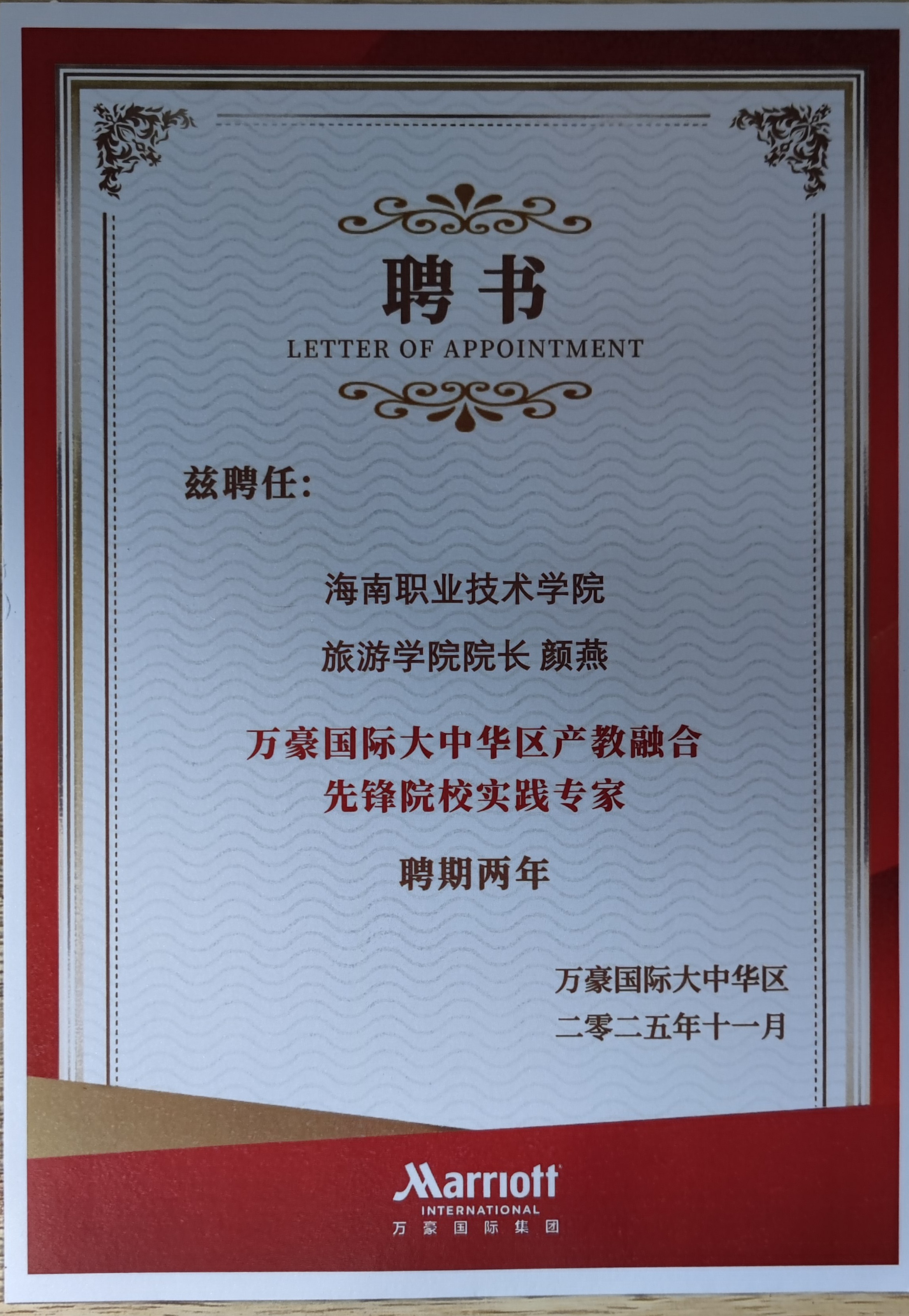 在本次大会上,我校凭借在产教融合与职业能力建设方面的系统实践,从万豪国际集团全国852所合作院校中脱颖而出,荣膺“职业培训先锋奖”。该奖项充分肯定了我校在推动国家职业技能等级认证与行业标准对接方面的先行作用,特别是在促进学生获得行业权威认证方面的机制化成果。旅游学院颜燕院长同时受聘为“万豪国际大中华区产教融合先锋院校实践专家”,标志着我院在协同育人方面的实践成果获得行业高度认可。