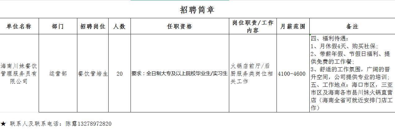 2026年招聘会企业招聘信息-海南川妹餐饮公司