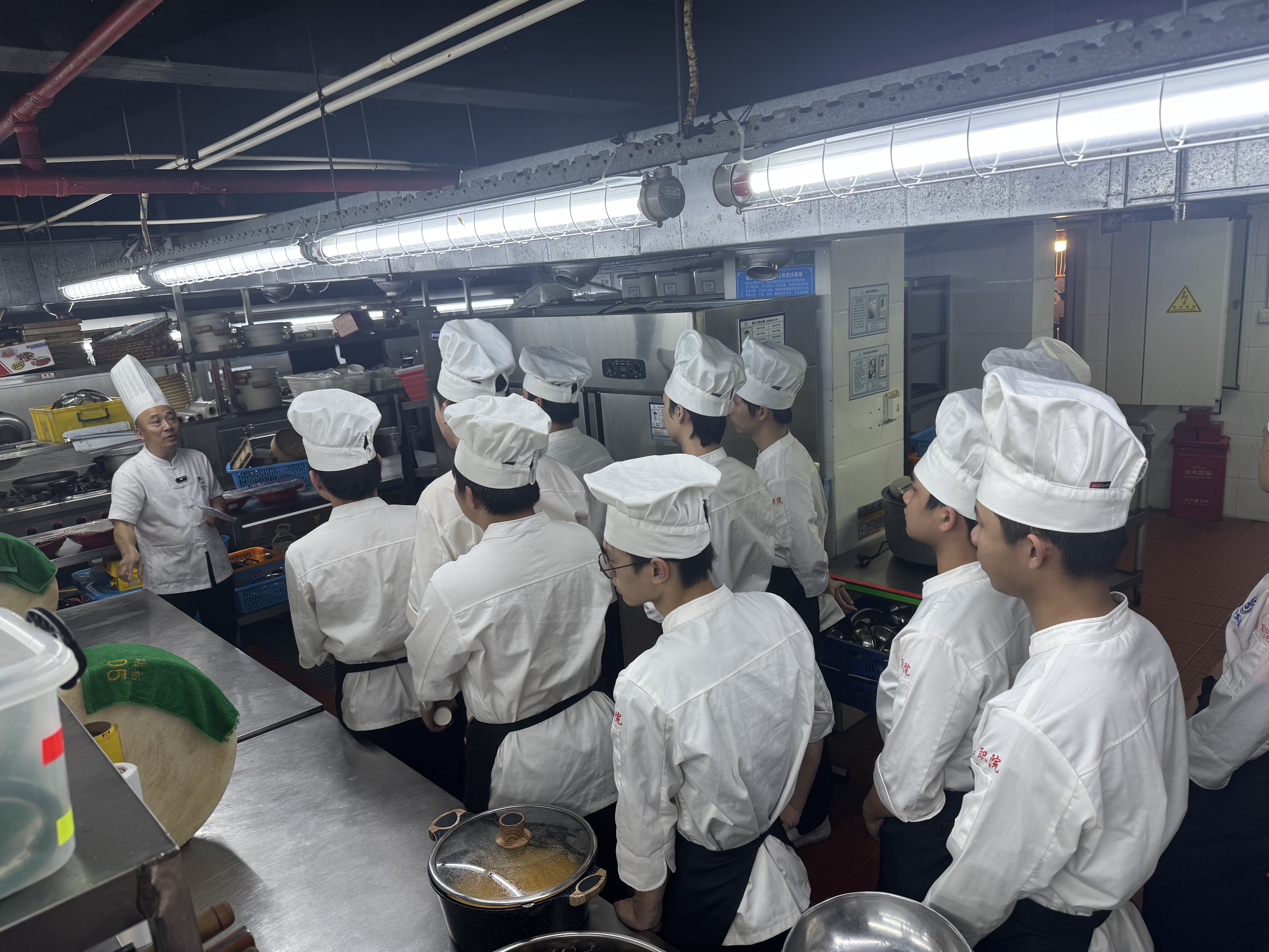 4月22日至24日期间,我院烹饪专业2024级的121名学生集体前往琼菜记忆·经典海南菜(美兰店),深入餐饮企业一线,开展了一场为期三天的岗位化教学实践活动。本次实践特别邀请了企业行政总厨韩钦畴先生以及餐厅经理林师莉女士共同担任指导教师,全程负责学生的教学与实操指导。